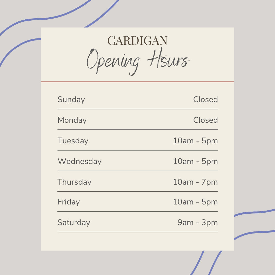 Shop with us at Cardigan during these hours! We would love to help you find your next favorite outfit.