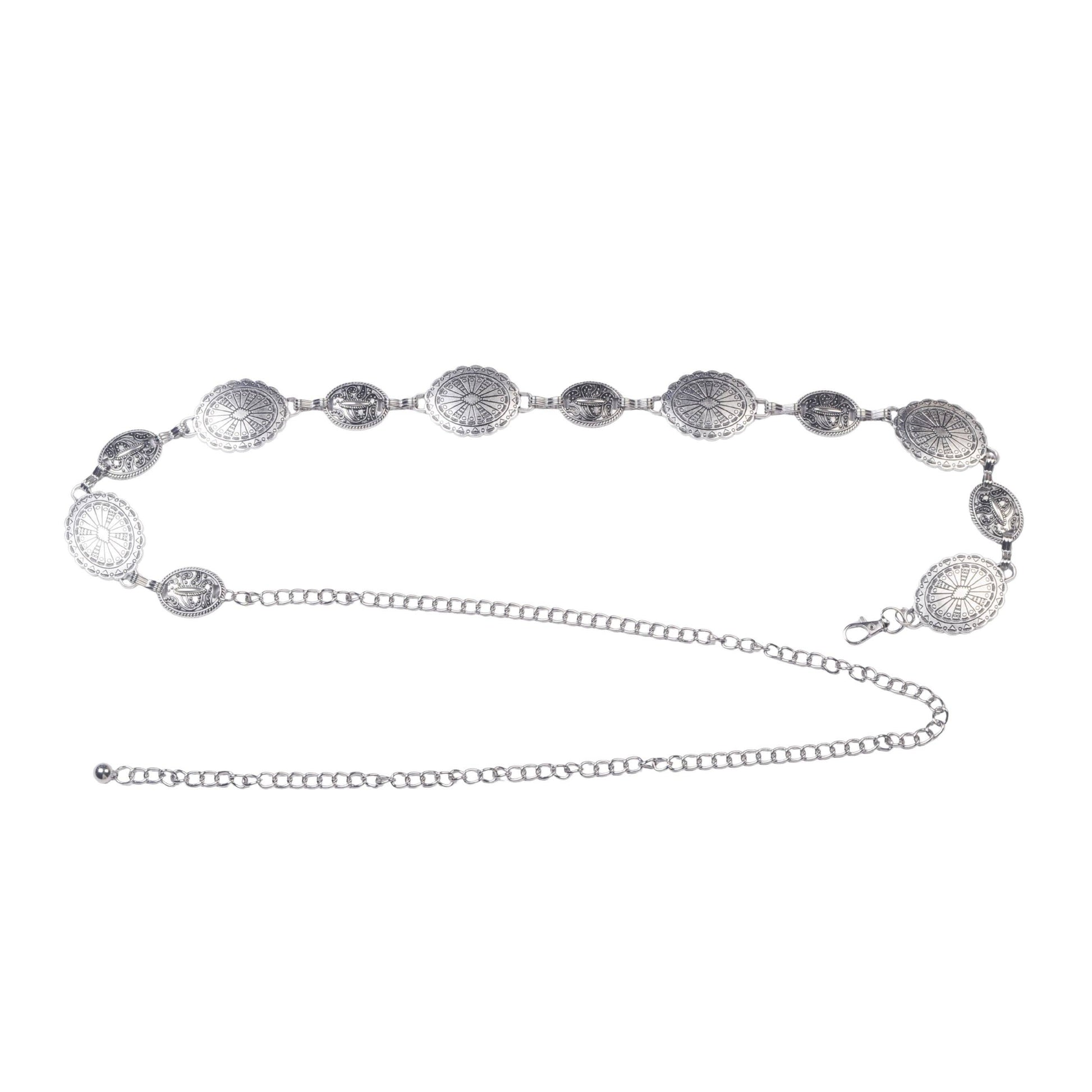 Keywords: mixed size concho belt, silver concho chain belt, alternating concho belt, Western belt for women, statement chain belt, boho concho belt, festival fashion belt, adjustable waist chain