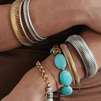Introducing the Baia Thick Coil Bangle, a stunning piece of jewelry that will elevate any outfit. This bangle is not only stylish, but also ethically sourced and made, so you can feel good about wearing it. Crafted from 18K gold plated stainless steel, it is waterproof and tarnish resistant, making it perfect for everyday wear. Plus, it is hypoallergenic, making it suitable for even the most sensitive skin. This classic and layer-able design can be dressed up or down, making it a versatile addition to any jewelry collection.