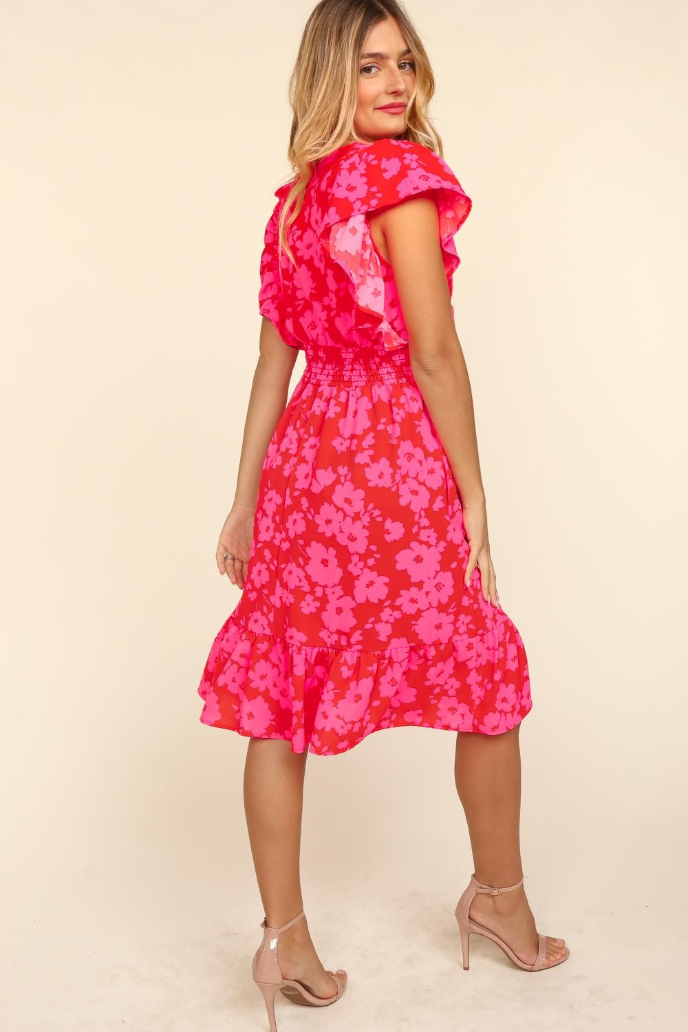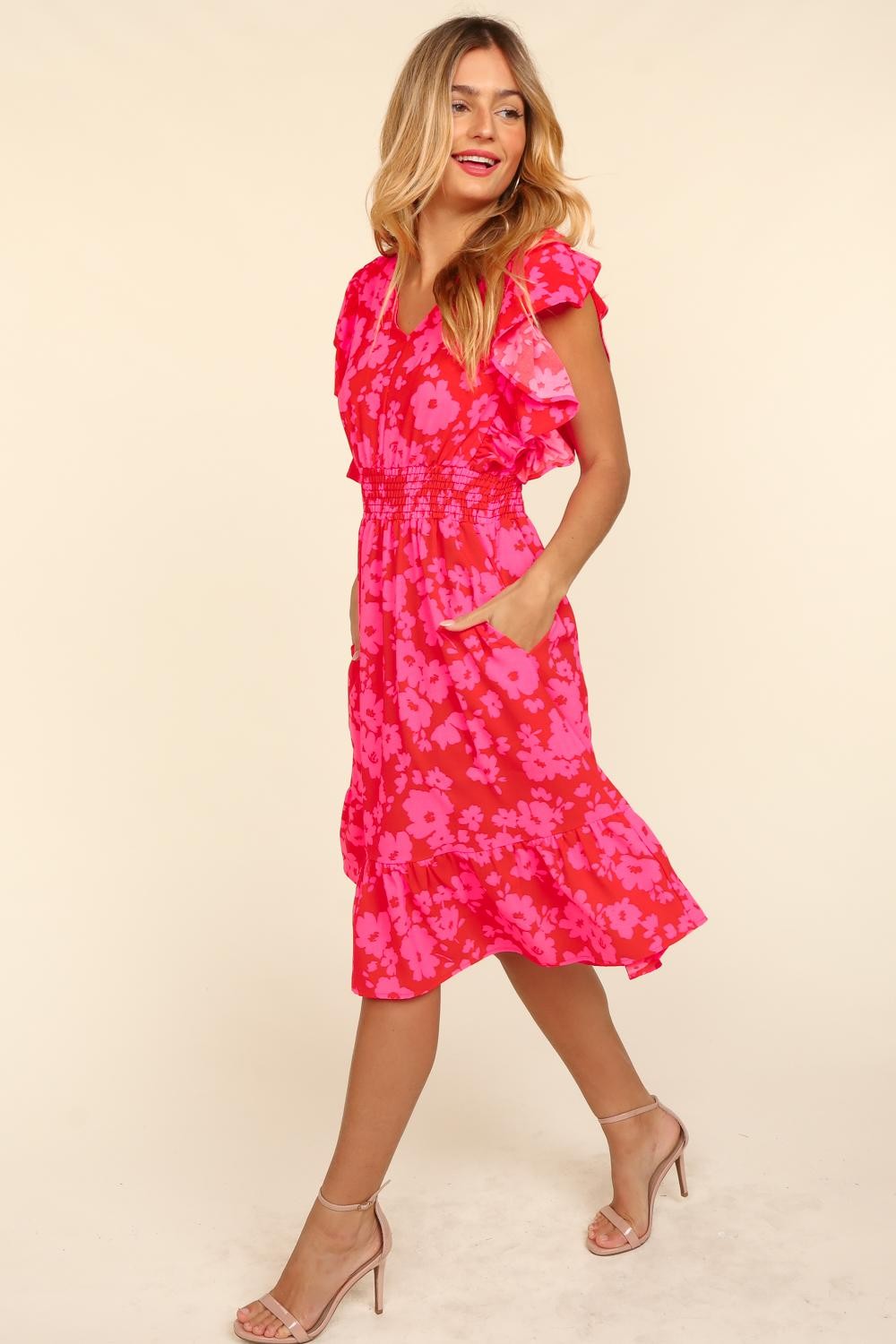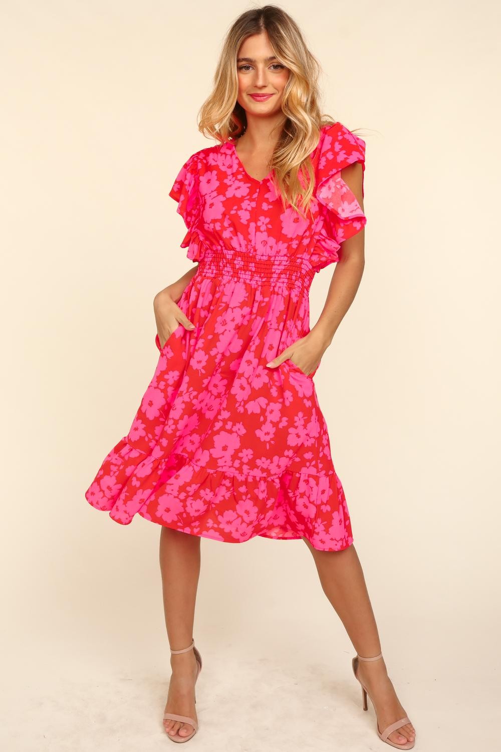 Introducing the Bree Dress - the perfect combination of style and comfort. This plus size dress features a flattering v-neck, trendy ruffle frill short sleeves, and a flattering fit and flare design. The smocking waist gives a slimming silhouette, while the ruffle hem and pockets add a fun touch. Get ready to turn heads in the Bree Dress!