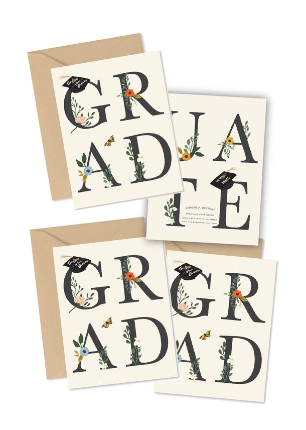 Celebrate your grad in style with our grad card set! This set includes eight unique cards with a blank interior, perfect for personalized messages at graduation parties.