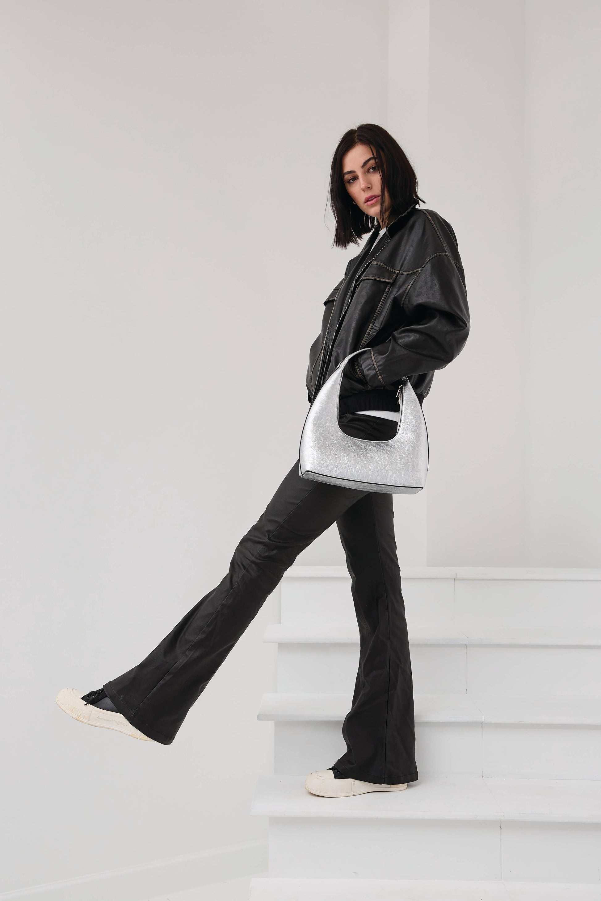 Add a touch of metallic flair to your fall outfit with the Atlanta Shaped Metallic Shoulder Bag—perfect for infusing your ensemble with standout style.