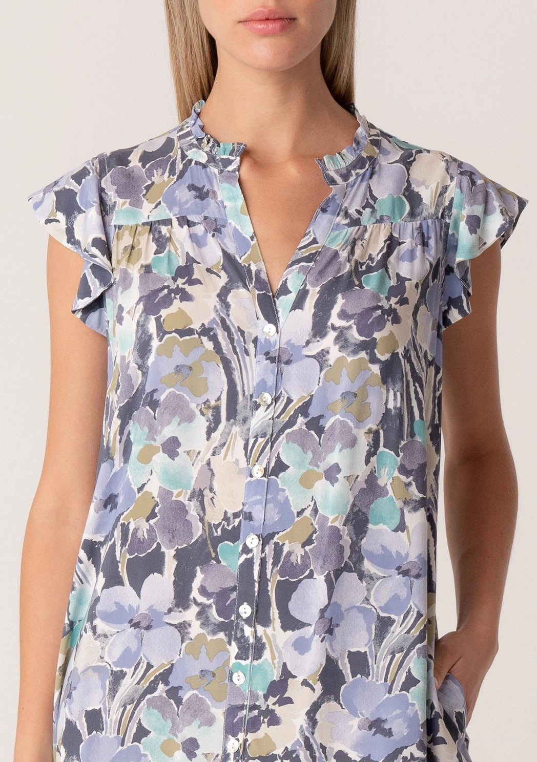 Get ready to bloom in the Kate Dress! This floral mini dress boasts a playful ruffled split neckline and flutter cap sleeves.
