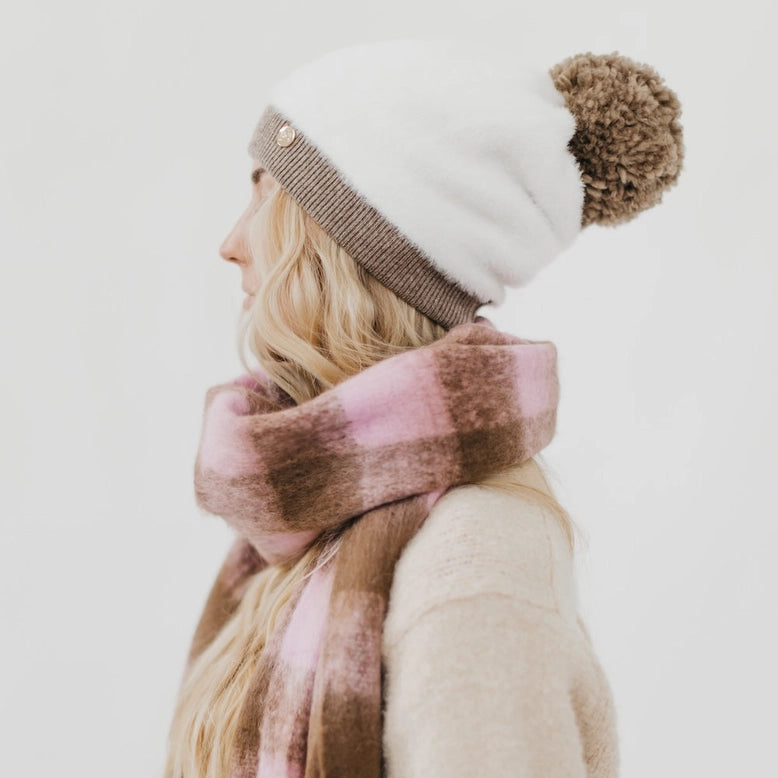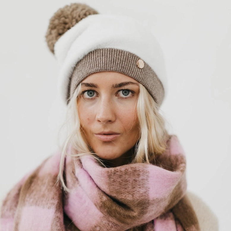 Stay cozy and stylish with our Lucia Beanie! This white and brown beanie is made from soft material, keeping you warm while adding a touch of fun with a pom pom on top. Perfect for any winter outfit.