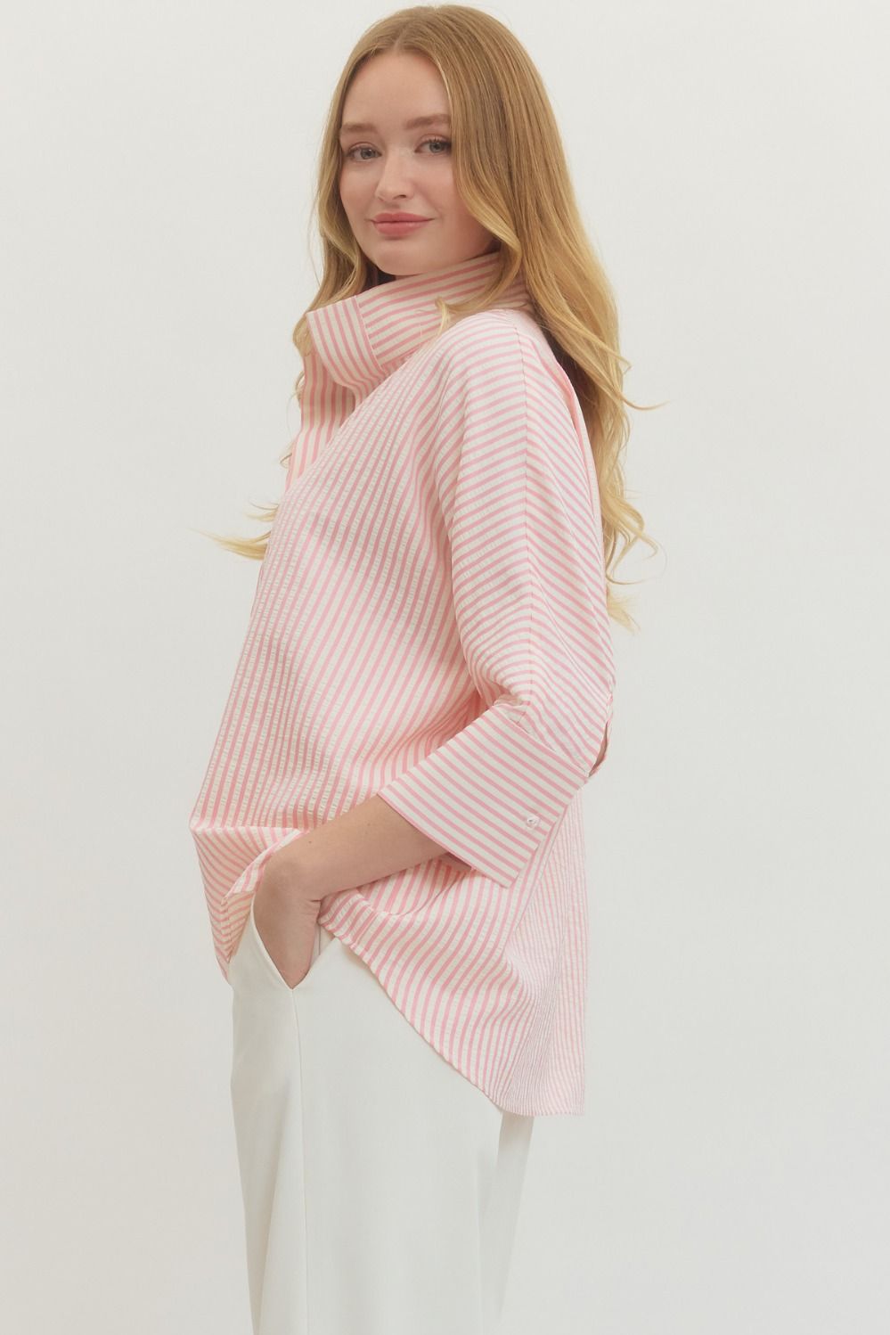 Striped 3/4 sleeve top featuring wide collar with button closure at front. Button detail at sleeve cuffs. Unlined. Woven. Non-sheer. Lightweight.