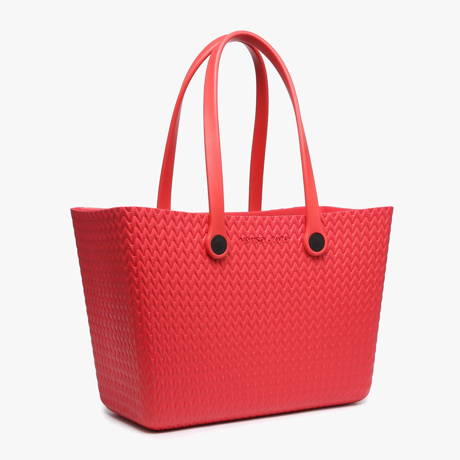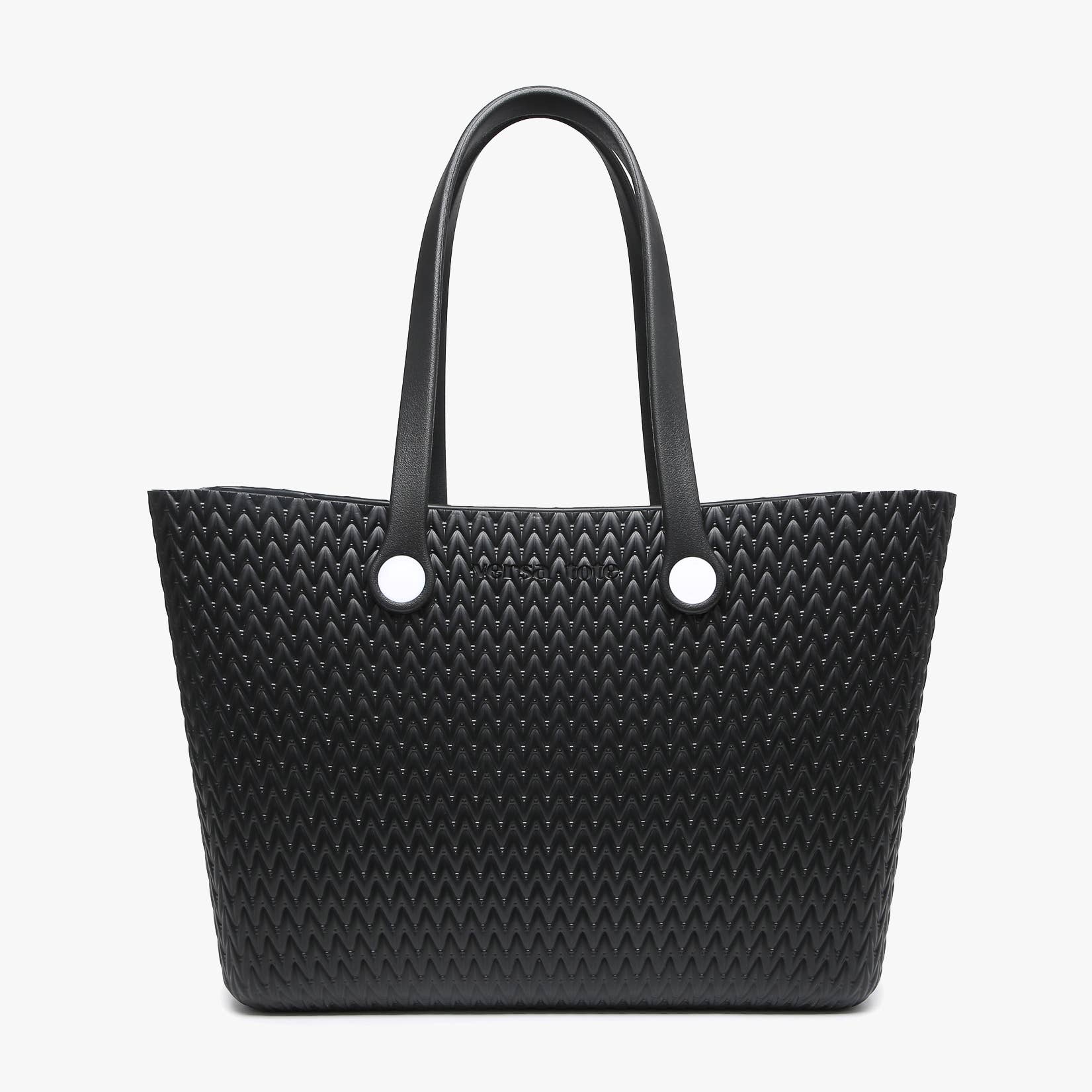 -Removable straps -Washable interior Dimensions: -Length: 17.5 inches -Height: 11 inches -Depth: 7.5 inches The Carrie Textured Versa Tote with Straps is crafted from EVA rubber, this tote bag is lightweight, durable, and waterproof, making it ideal for everyday use. The removable straps add versatility, while the washable interior ensures easy cleaning. Pair it with a set of interchangeable straps (sold separately) to customize your look.